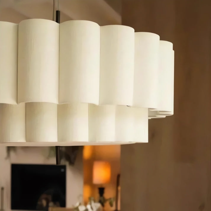 A chandelier of softness and simplicity. The Meri chandelier is crafted with a layered fabric shade that diffuses light into a warm, ambient glow. Its sculptural folds create depth and texture while maintaining a gentle, understated presence. Perfect above dining tables, in bedrooms, or living spaces, Meri balances form and function with quiet elegance.